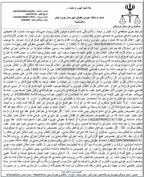 به موجب نامه به شماره قضایی 140340990001999884 مورخ 14-3-140 پلیس راهور شهرستان کیش به شعبه اجرای احكام مدنی شهرستان جزیره کیش پیوست شماره (6) اعلام نموده است که در طی چندین مرحله بازدید از خودرو در اثر زنگ زدگی بر اثر رطوبت جزیره رؤیت شماره موتور میسر نگردید و برابر دستور العمل های صادره امکان نقل و انتقال خودرو با این شرایط وجود ندارد. در نهایت با عطف توجه به نکات فوق الذکر و با عنایت به اعلام فسخ قرارداد و احراز عدم امکان نقل و انتقال خودرو با شرایط موجود تقاضای تأیید فسخ قرارداد از سوی مرجع قضایی جهت بار نمودن آثار حقوقی فسخ عقود به همراه هزینه های دادرسی و حق الوكاله ی وكیل طبق تعرفه مورد استدعا میباشد.
