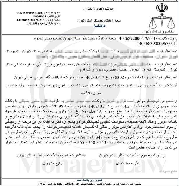پرونده کلاسه 140268920004799337 شعبه 99 دادگاه عمومی حقوقی مجتمع قضایی عدالت تهران تصمیم نهایی 140268390015668302 شماره